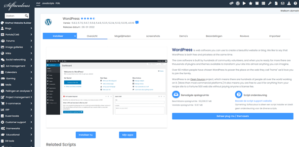 Je komt dan in het programma Softaculous. Via dit programma kun je vrijwel alles installeren op je hostingpakket (en dus) domeinnaam.