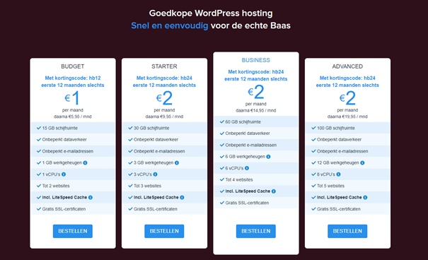 Heb je al WordPress hosting + domeinnaam gekocht? Zie ook https://hostingbaas.nl/wordpress/goedkope-wordpress-hosting . Zodra je dit gedaan hebt, kun je doorgaan naar stap 2 voor de installatie van WordPress!
